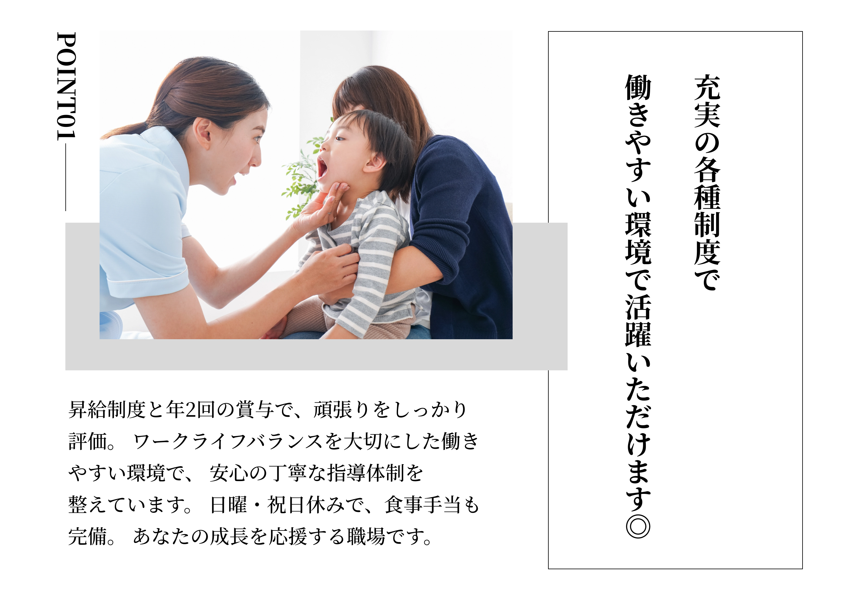【休日】日曜・祝日 ※その他の休日については、シフト制で調整可能です。 |