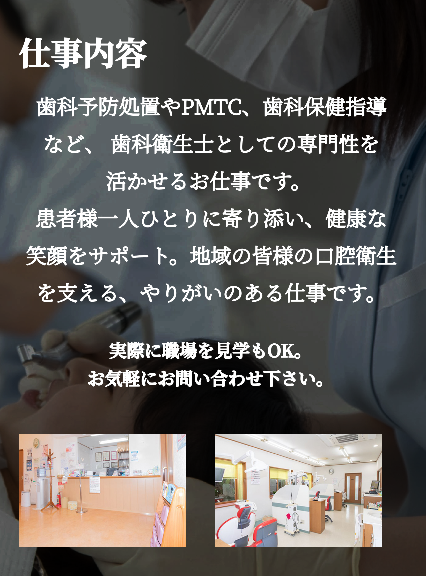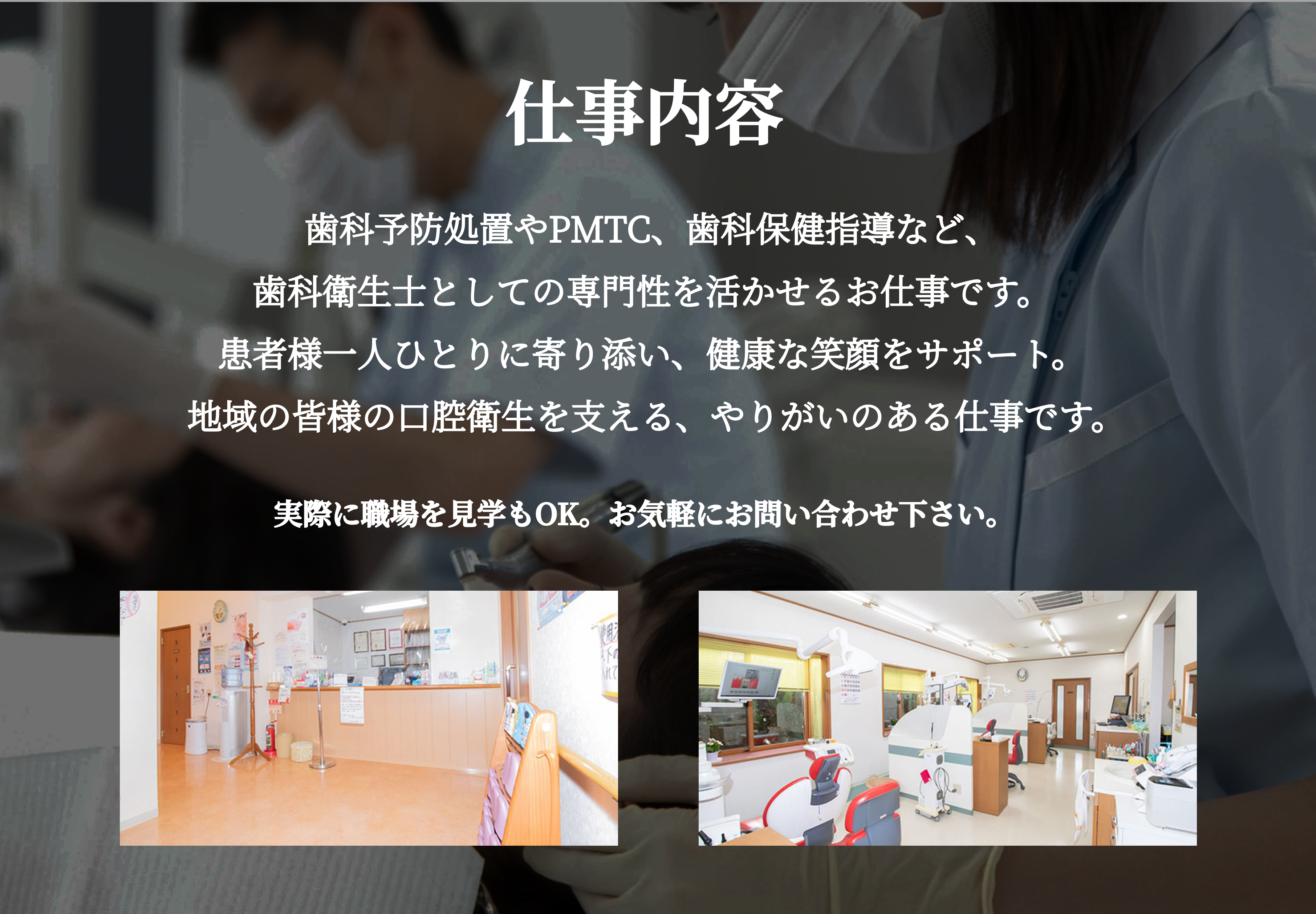 ・歯科衛生士としての基本的な業務全般 ・患者様への歯科保健指導 ・歯科診療補助 ・予防処置(歯石除去、PMTCなど) *変更範囲:会社の定める業務 |